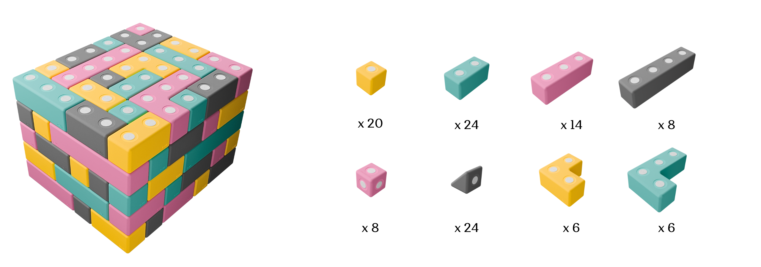 Zestaw TUKI® Builder zawiera klocki w czterech kolorach: turkusowym, żółtym, szarym i różowym, co pozwala na tworzenie kreatywnych i przyjemnych dla oka kompozycji.