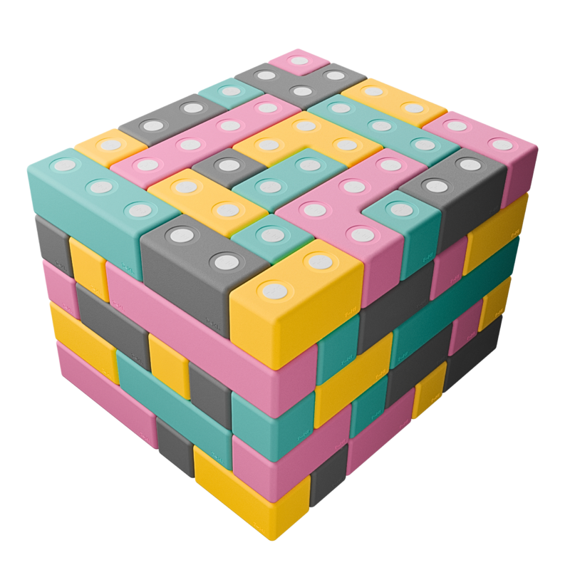- Kapsuły z magnesami neodymowymi wewnątrz każdego elementu pozwalają na stabilne łączenie się klocków, unikając spotkania identycznych biegunów.