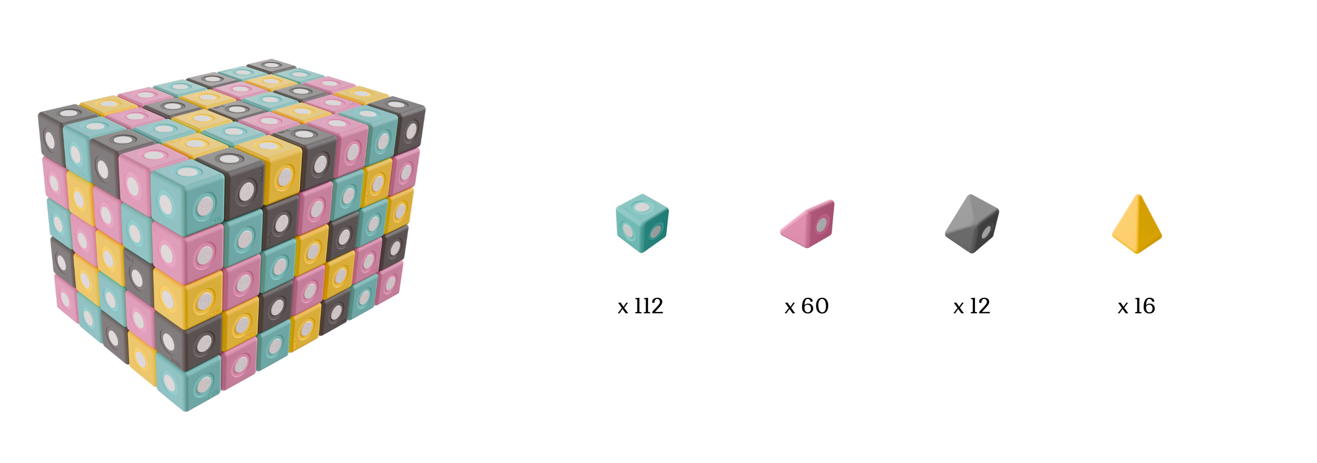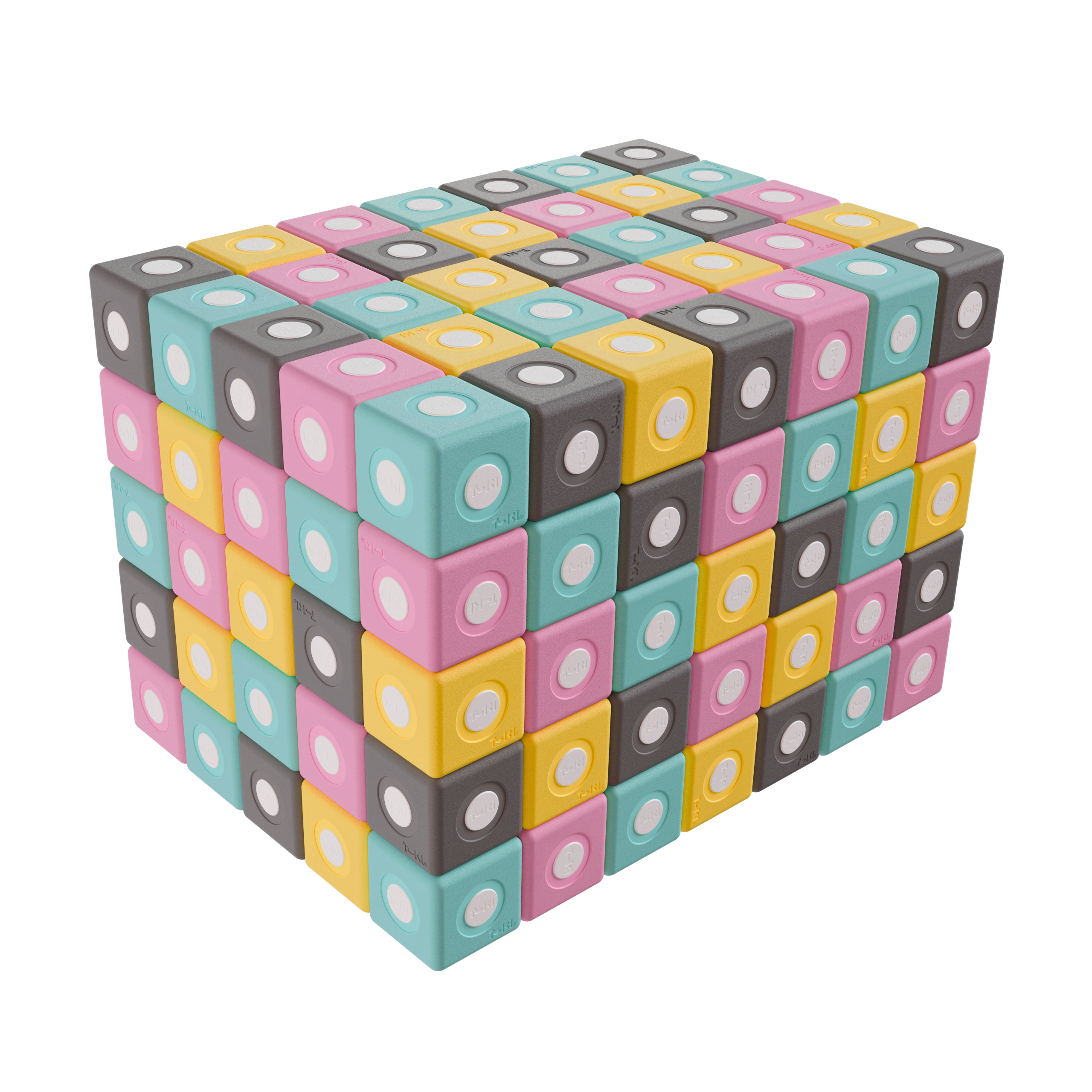 Zestaw TUKI® Smart zawiera klocki w czterech kolorach: turkusowym, żółtym, szarym i różowym, co pozwala na tworzenie kreatywnych i przyjemnych dla oka kompozycji.