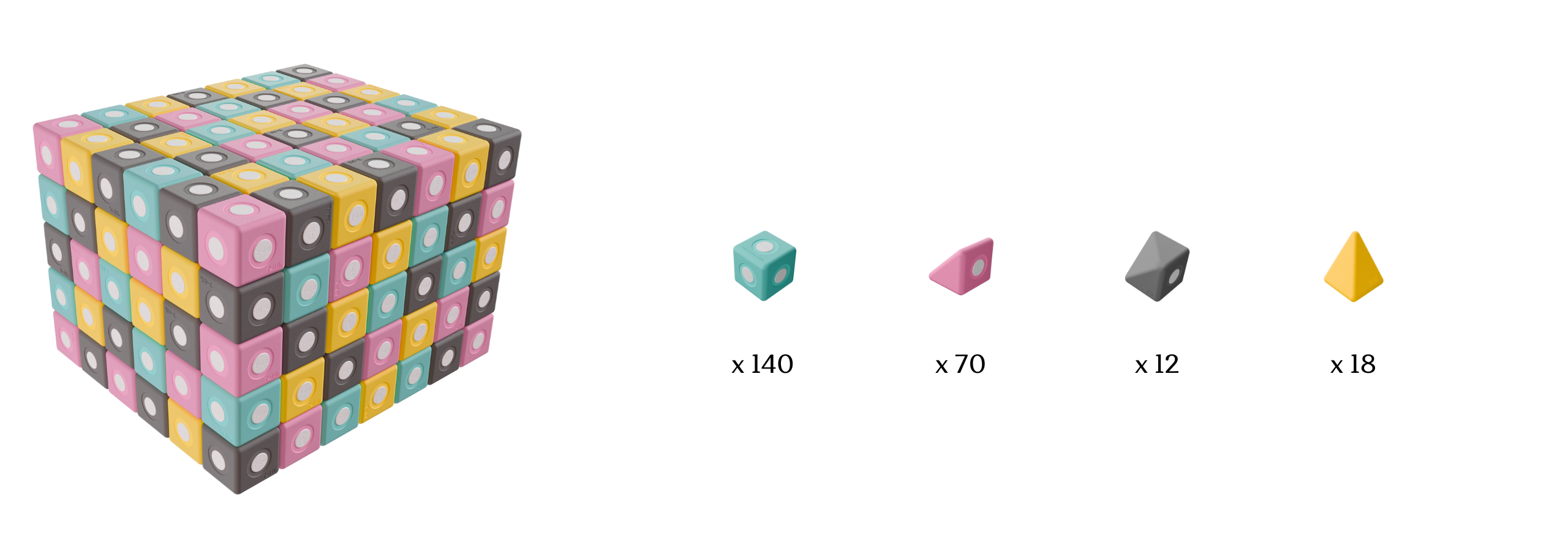 - Kapsuły z magnesami neodymowymi wewnątrz każdego elementu pozwalają na stabilne łączenie się klocków, unikając spotkania identycznych biegunów.