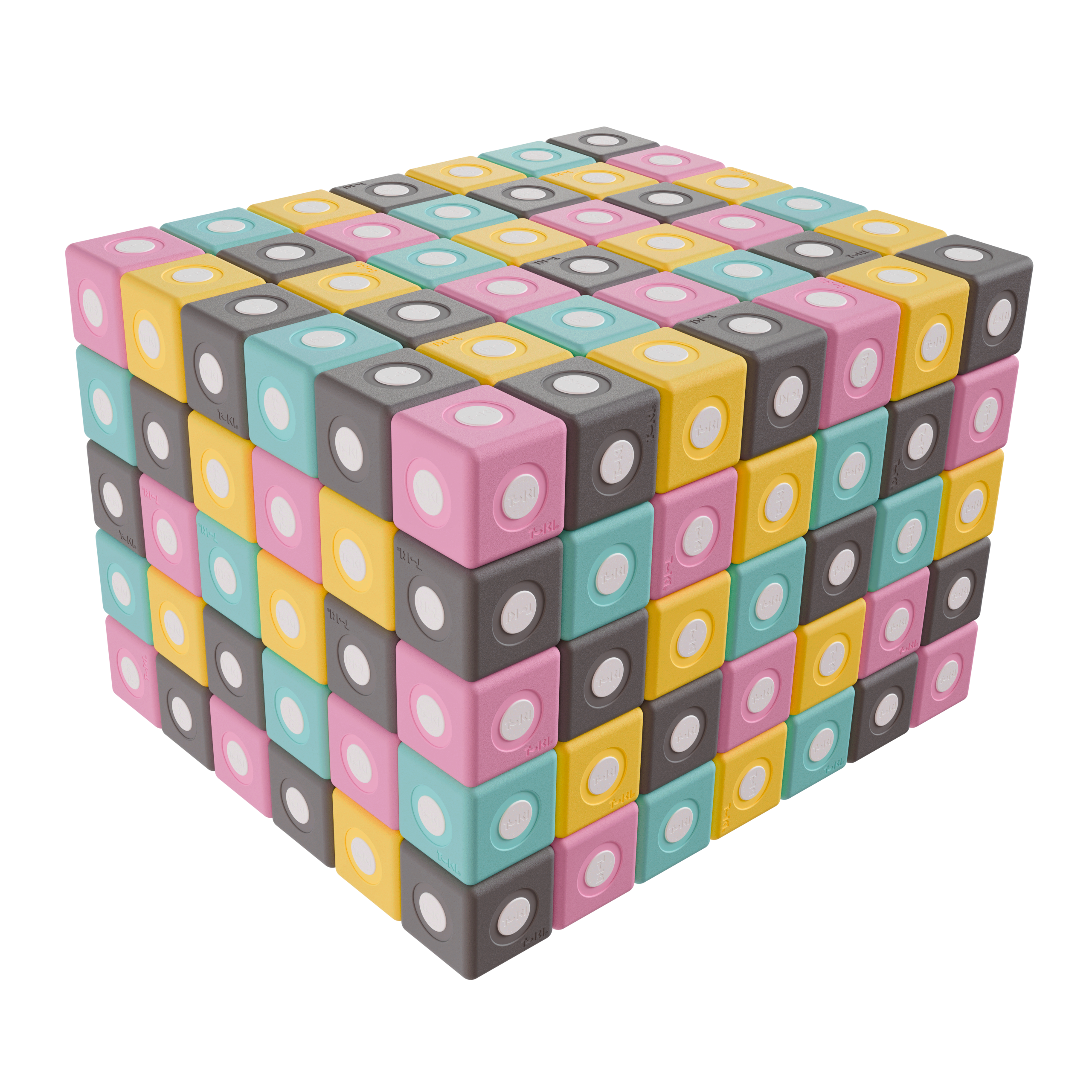 Zestaw TUKI® Smart zawiera klocki w czterech kolorach: turkusowym, żółtym, szarym i różowym, co pozwala na tworzenie kreatywnych i przyjemnych dla oka kompozycji.