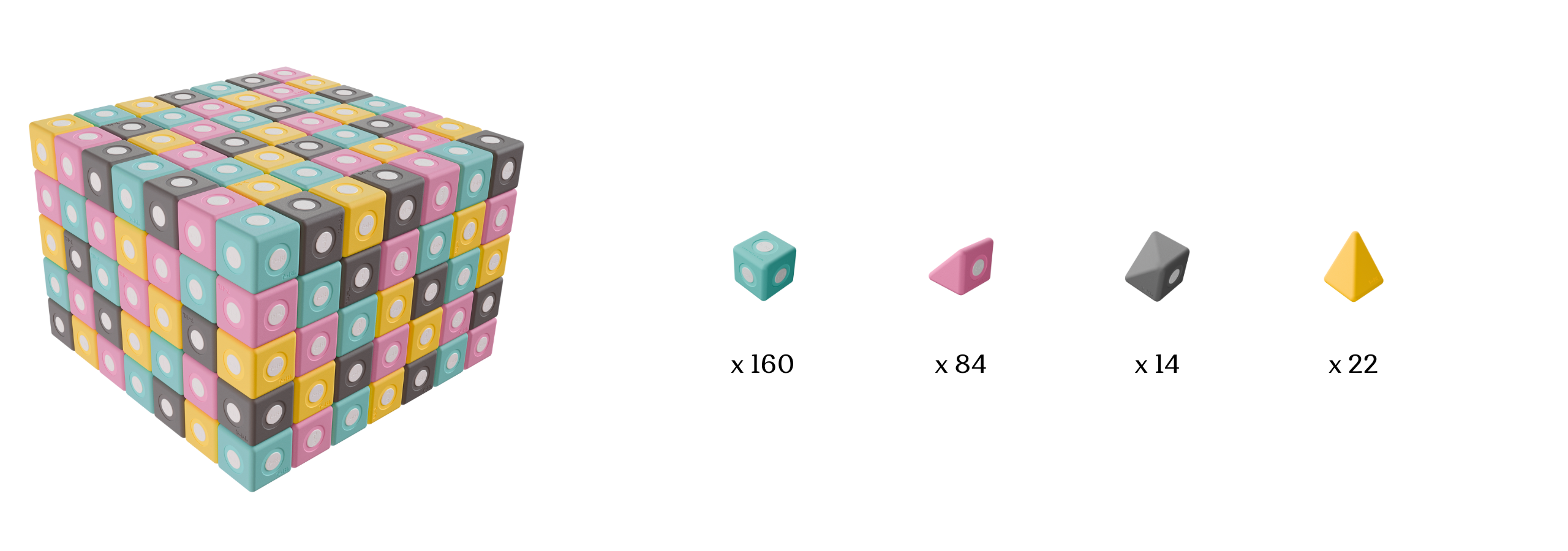 - Kapsuły z magnesami neodymowymi wewnątrz każdego elementu pozwalają na stabilne łączenie się klocków, unikając spotkania identycznych biegunów.