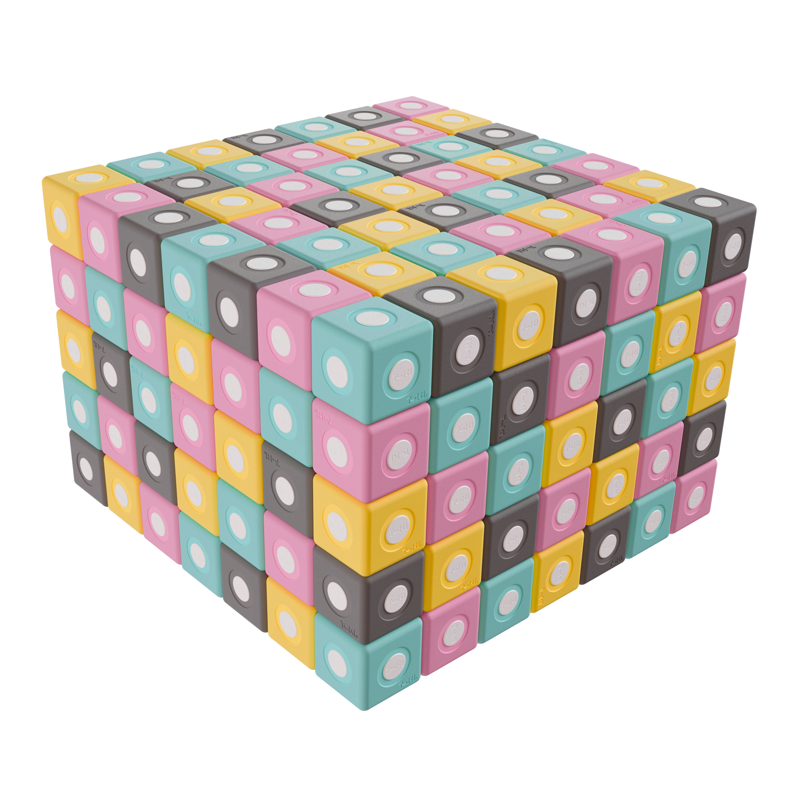 Zestaw TUKI® Smart zawiera klocki w czterech kolorach: turkusowym, żółtym, szarym i różowym, co pozwala na tworzenie kreatywnych i przyjemnych dla oka kompozycji.