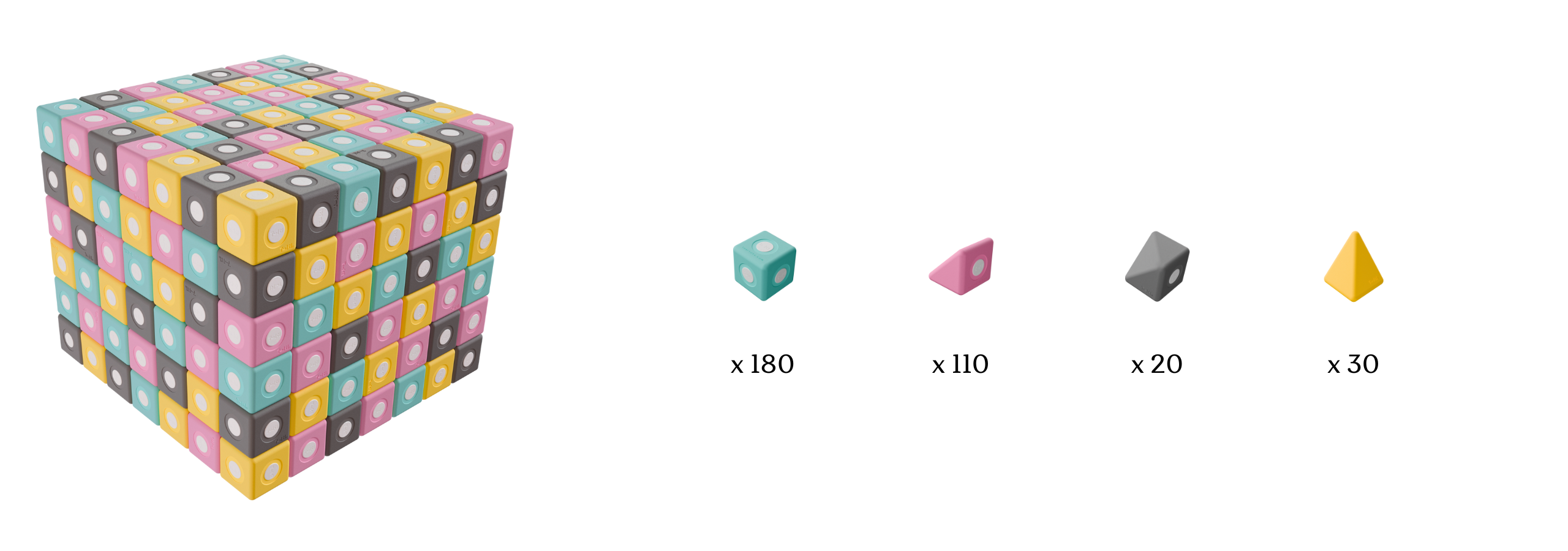 - Kapsuły z magnesami neodymowymi wewnątrz każdego elementu pozwalają na stabilne łączenie się klocków, unikając spotkania identycznych biegunów.
