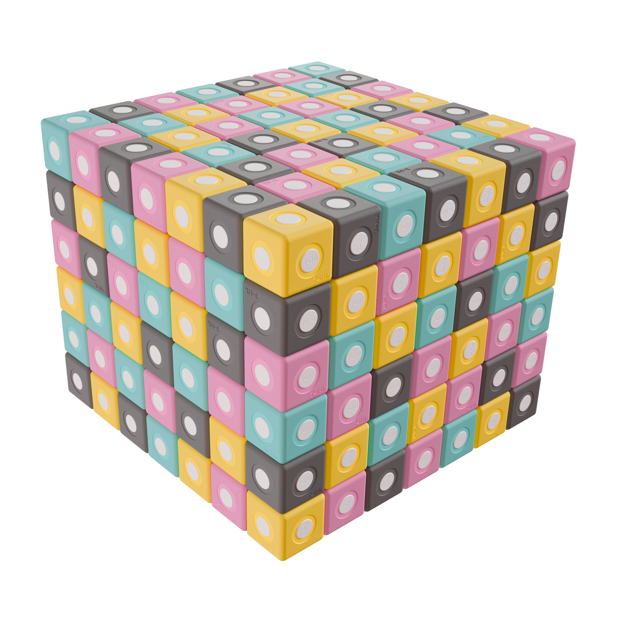 Zestaw TUKI® Smart zawiera klocki w czterech kolorach: turkusowym, żółtym, szarym i różowym, co pozwala na tworzenie kreatywnych i przyjemnych dla oka kompozycji.