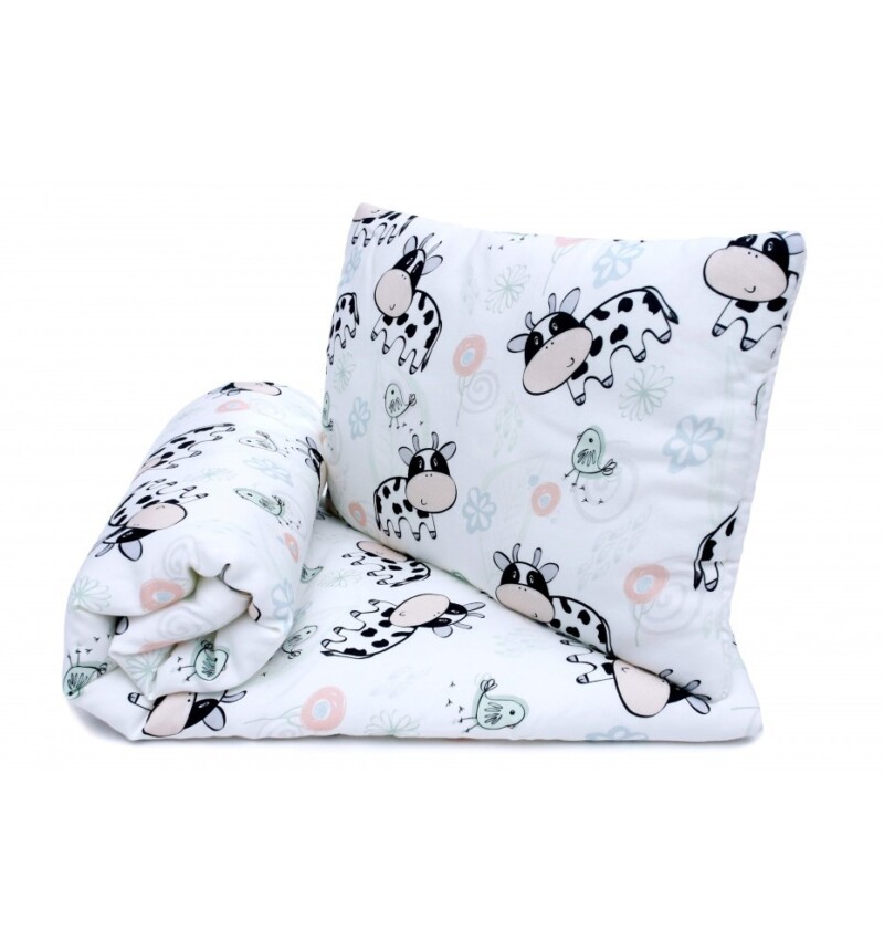 Komplecik składa się z poduszki i kołderki, które posiadają ciepłe, antyalergiczne wypełnienie silikonowe na stałe zszyte z materiałem. Rozwiązanie to jest bardzo higieniczne i praktyczne, sprawdzi się w domu,na wyjazdach oraz w przedszkolu.