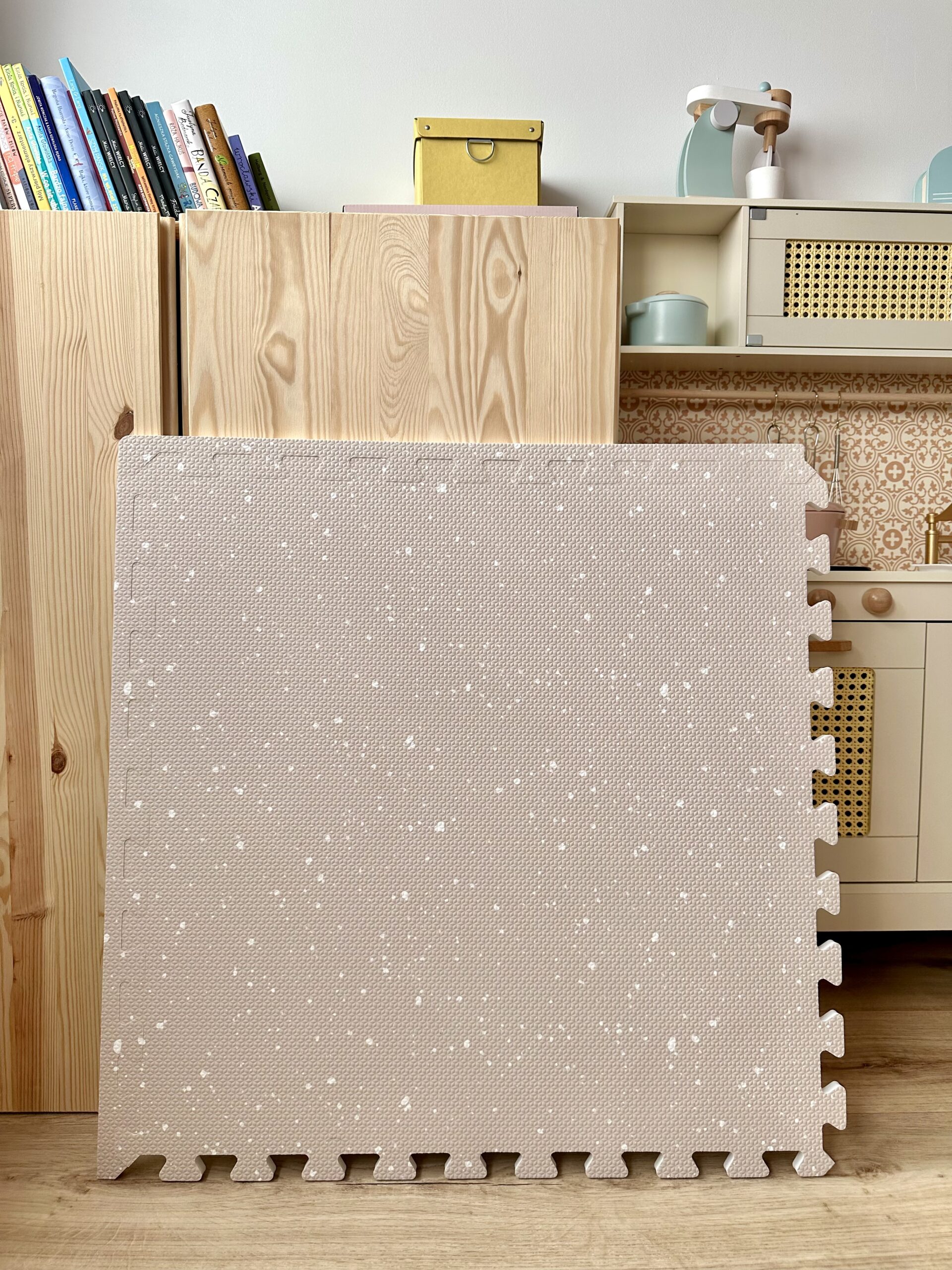 Oferujemy matę piankową w kolorze kawy z mlekiem z delikatnymi kropeczkami, które przypominają atrament. To idealne połączenie naturalnego spokoju i bezpieczeństwa dla Twojego maluszka.