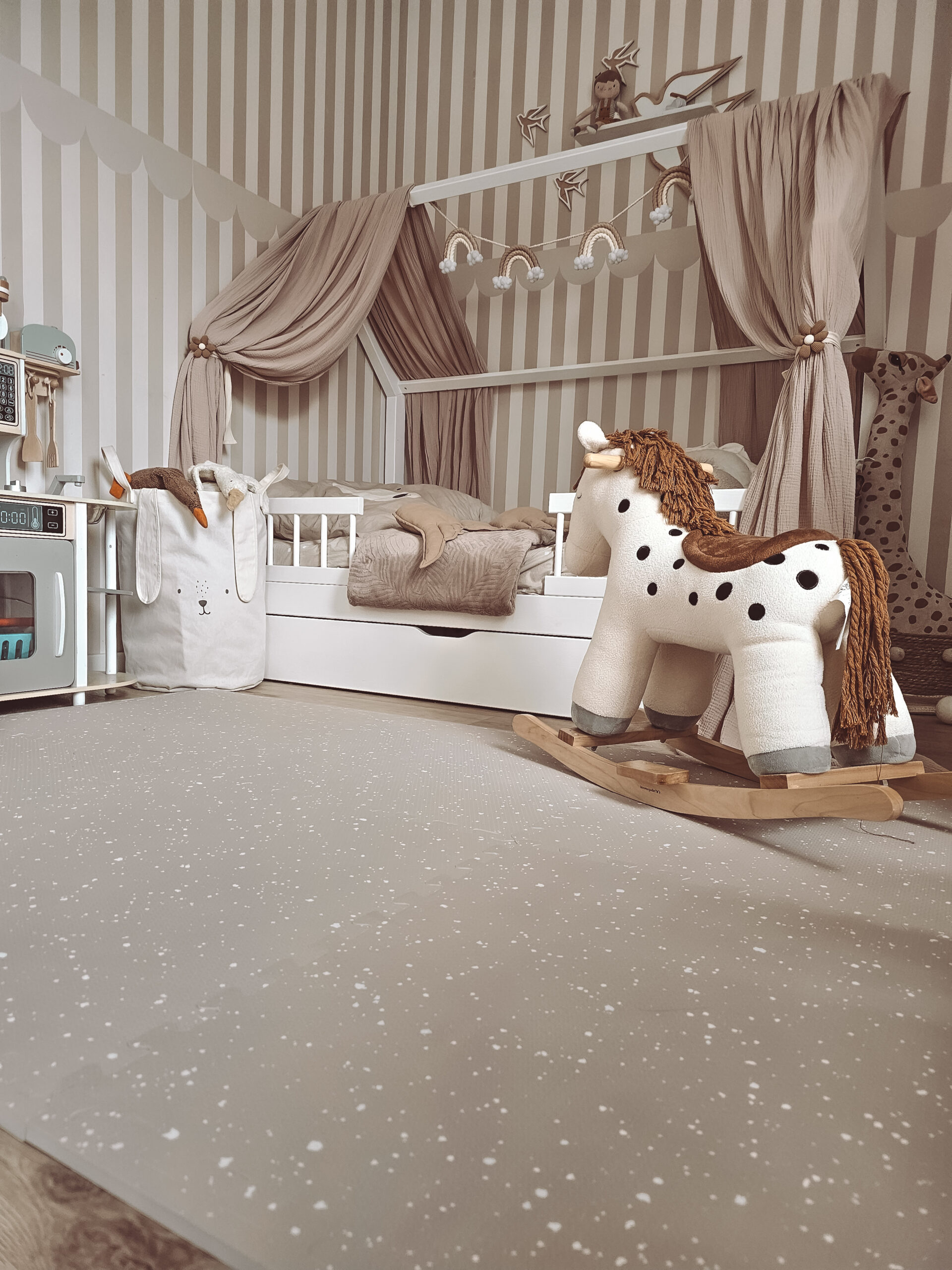Mata idealnie sprawdzi się dla niemowląt podczas pierwszych aktywności jak leżenie na brzuszku, pełzanie, turlanie czy też raczkowanie.Dodatkowym atutem jest możliwość łatwego dostosowania rozmiaru maty do indywidualnych potrzeb – czy ma ona pełnić funkcję dywanu w salonie czy pokrywać cały pokój zabaw dziecka. Unikalny design mat OLYA KIDS utrzymany w minimalistycznym stylu doskonale wpasuje się w charakter Twojego wnętrza, będąc jednocześnie doskonałym tłem do fotografowania pierwszych chwil Twojego maluszka.