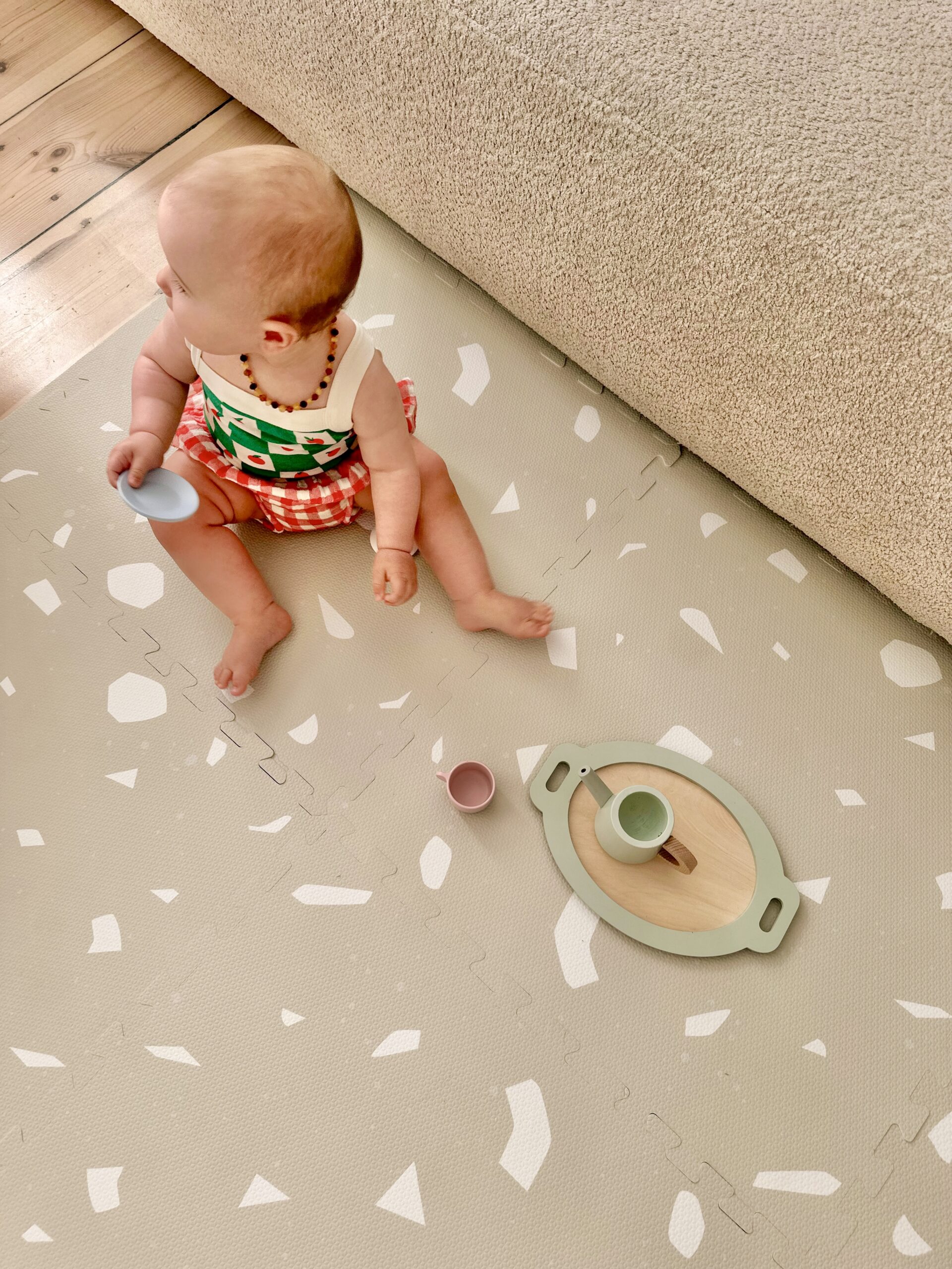 - Mata puzzlowa TERRAZZO Taupe to kwintesencja nowoczesnego minimalizmu. Jej beżowo-szary odcień, balansujący między ciepłym piaskiem a chłodniejszą szarością, tworzy idealne tło dla wzoru do złudzenia przypominającego klasyczne lastryko. To wybór dla osób, które cenią subtelność i chcą, by strefa zabawy dziecka była naturalnym przedłużeniem stylowego salonu.