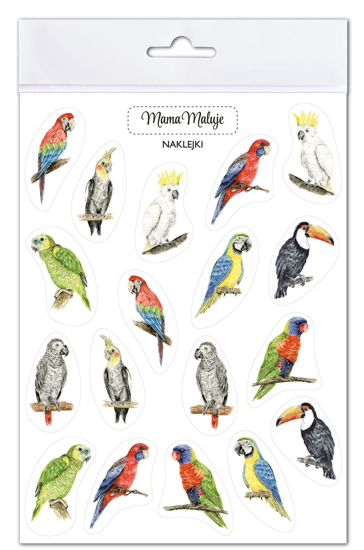 Naklejki zwierzęta domowe Mama Maluje przedstawiają 17 obrazków ptaków – jest to zestaw mniejszych naklejek.
