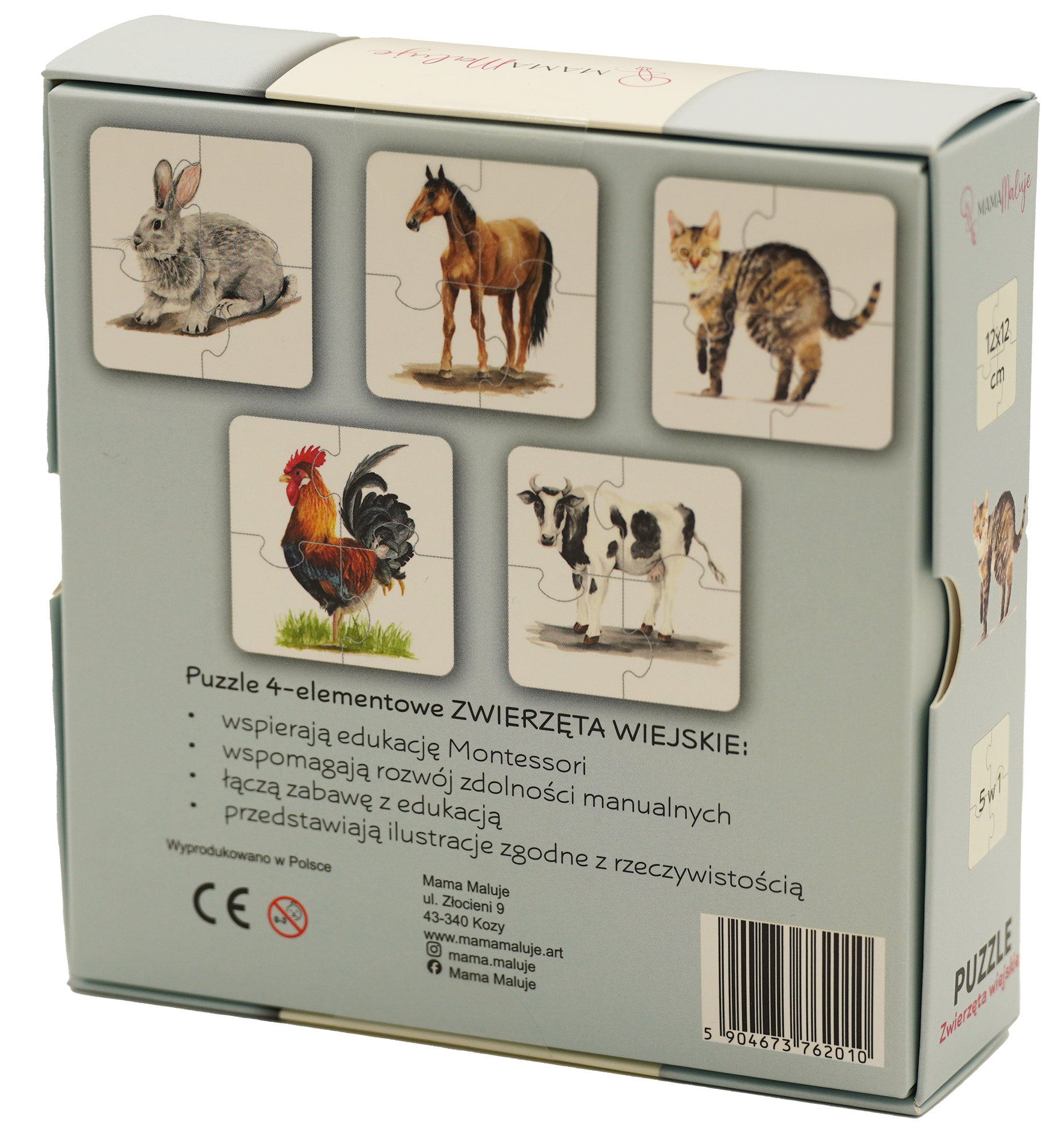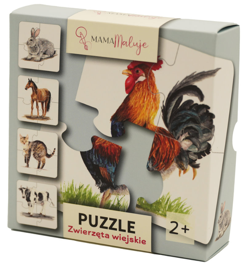Puzzle zwierzęta wiejskie Mama Maluje składają się z 20 elementów (5 obrazków przedstawiających zwierzęta).