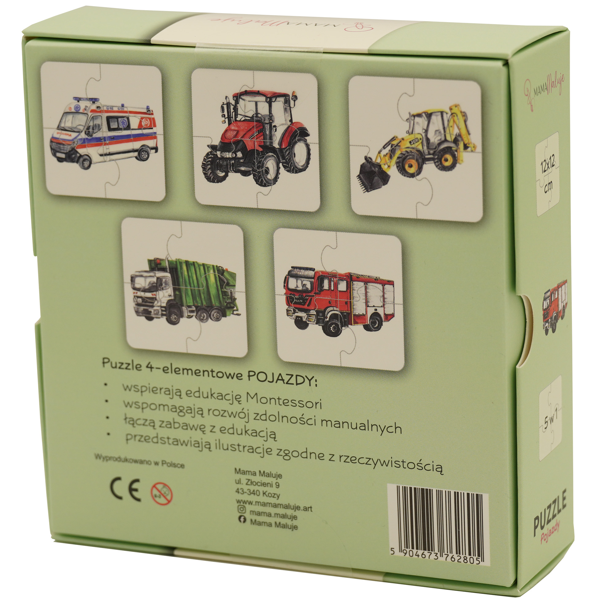 Puzzle pojazdy Mama Maluje składają się z 20 elementów (5 obrazków przedstawiających traktor, śmieciarkę, wóz strażacki, koparkoładowarkę, karetkę).